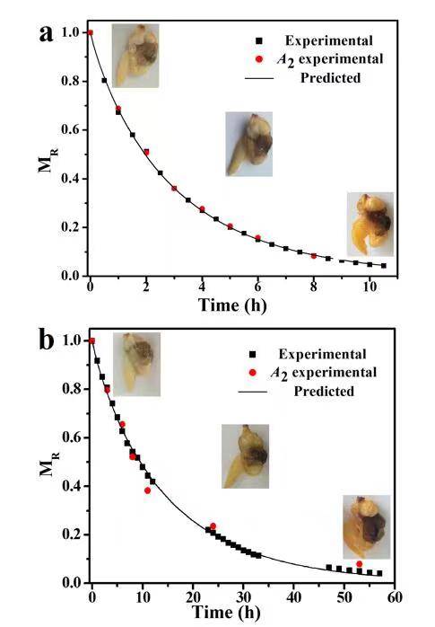 圖2.實(shí)際水分與核磁數(shù)據(jù)峰面積的熱風(fēng)干燥曲線(a)和自然晾曬干燥曲線(b)
