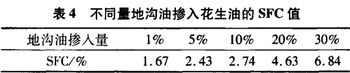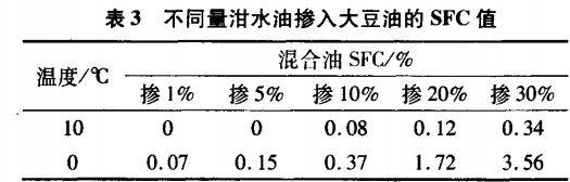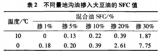 分別取不同量地溝油和泔水油摻人大豆油中,使地溝油和泔水油占總油量的l%、5%、10%、20%和30%,分別記錄混合油在10、0℃下的SFC值。