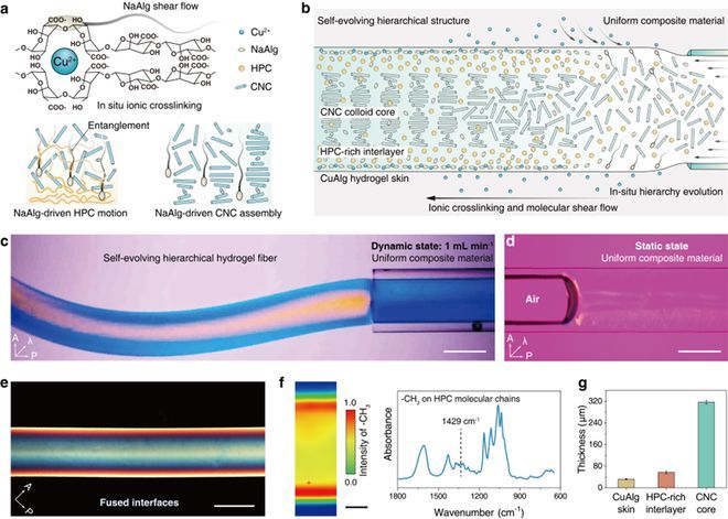 圖2. 水凝膠纖維的自進(jìn)化過程與分層結(jié)構(gòu)表征