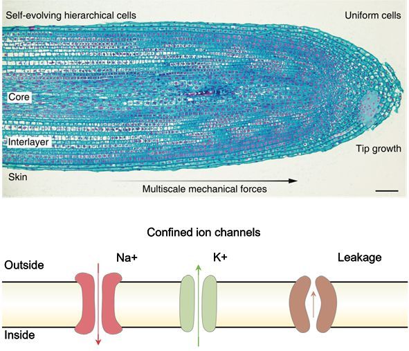 生物體中普遍存在著界面融合的層級(jí)組織,比如樹木的年輪、蘋果的果肉和果皮、動(dòng)物的皮膚組織等。盡管這些組織結(jié)構(gòu)具有不同密度、模量或組分,但它們之間的界面是融合在一起的。這種界面融合的組織不僅可以確保多尺度結(jié)構(gòu)之間高效的物質(zhì)交換、能量傳遞與信息交互,還可以平衡組織間的應(yīng)力分布,以保持整體和局部力學(xué)性能之間的均衡。除了基因?qū)蛹?jí)結(jié)構(gòu)進(jìn)行的初始編碼外,由基本模塊原位產(chǎn)生的力和相互作用也對(duì)這種界面融合層級(jí)結(jié)構(gòu)的進(jìn)化與形成起到至關(guān)重要作用。在生命體演化過程中,層級(jí)結(jié)構(gòu)內(nèi)部還會(huì)自發(fā)產(chǎn)生限域傳輸通道用于離子或水的超快選擇性輸送。這種限域傳輸通道對(duì)于離子或水的離散性具有極高敏感性,展現(xiàn)出獨(dú)特傳輸特性。然而,在人工材料的制造過程中,實(shí)現(xiàn)界面自發(fā)融合以及限域通道原位形成仍然是一個(gè)巨大挑戰(zhàn)。