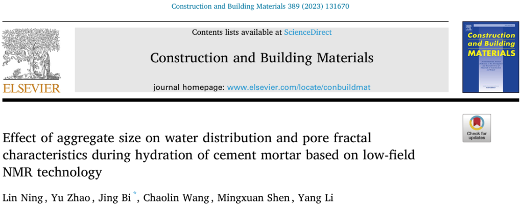 [1] Lin Ning, Yu Zhao, Jing Bi, et al. Effect of aggregate size on water distribution and pore fractal characteristics during hydration of cement mortar based on low-field NMR technology [J]. Construction and Building Materials, 2023. 389:131670。