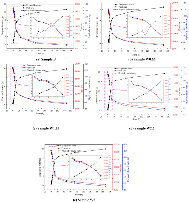 圖五 蒸發(fā)水、物理結(jié)合水和峰面積隨水化時間的變化