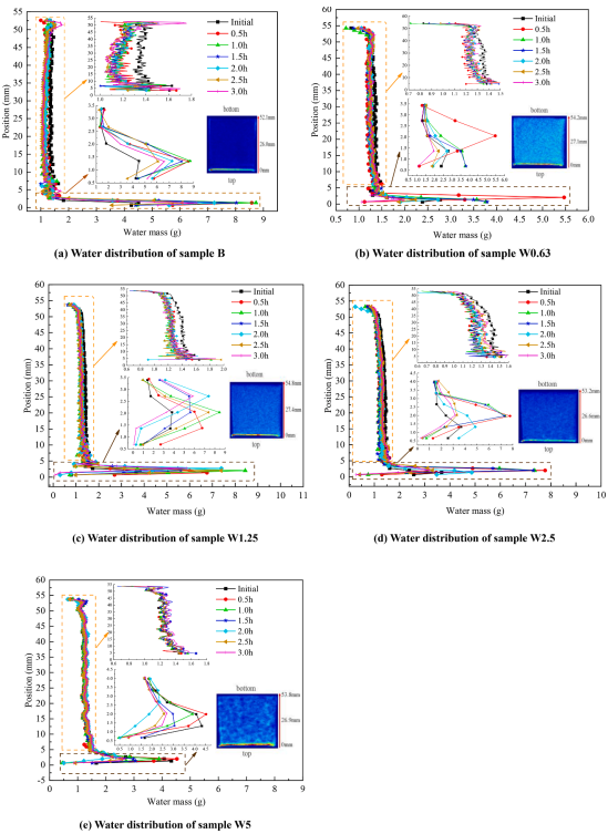 圖六為采用MRI位圖數(shù)據(jù)計算水化過程中水分空間分布。MRI的顏色深度反映了含水量, MRI位圖數(shù)據(jù)定量反映了相應(yīng)位置的顏色深度,因此,位圖數(shù)據(jù)也與含水量呈正相關(guān), 可以使用MRI位圖數(shù)據(jù)計算不同位置和時間的含水量。試樣頂部(0-3.0mm)含水量遠(yuǎn)遠(yuǎn)大于其他部位,該部分水被認(rèn)為是沁水。水化過程中,W5不同位置水分布在前3h變化不大,含水量整體上隨著深度增加逐漸減小并趨于穩(wěn)定,但在底部發(fā)生突變(先驟減后驟增)。隨著深度的增加,W0.63、W1.25和W2.5樣品的含水量先下降,在一定深度保持不變,然后再次下降。