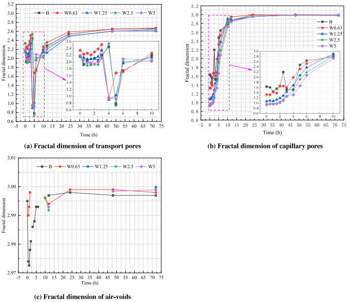 圖七為水化過程中過渡孔、毛細(xì)孔及氣孔分形維數(shù)變化。水化反應(yīng)前10h,過渡孔不穩(wěn)定,其分形維數(shù)在分形和非分形之間反復(fù)變化,過渡孔分形維數(shù)在前3 h呈U型變化,從大到小依次為W0.63、W1.25、B、W5、W2.5。在3-6h之間,水化反應(yīng)消耗凝膠孔隙中的游離水,靜水壓力作用下,過渡孔中的自由水被轉(zhuǎn)移到凝膠孔中,導(dǎo)致分形維數(shù)急劇下降。6h以后,隨著水化反應(yīng)進(jìn)行消耗大量自由水,導(dǎo)致孔隙中靜水壓增大到一定程度后,毛細(xì)孔中的水再次流入導(dǎo)致孔隙中的水化反應(yīng)加劇,分形維數(shù)再次增大??傊?,AS對過渡孔水化過程的影響主要是由于不同粒徑骨料的空間組合影響了水泥漿體的孔隙結(jié)構(gòu)分布導(dǎo)致水化程度和速率發(fā)生變化,分形維數(shù)發(fā)生復(fù)雜變化。且在水化初期,特別是前3 h, AS和組分影響過渡孔隙的分形,骨料越小,分形越明顯。