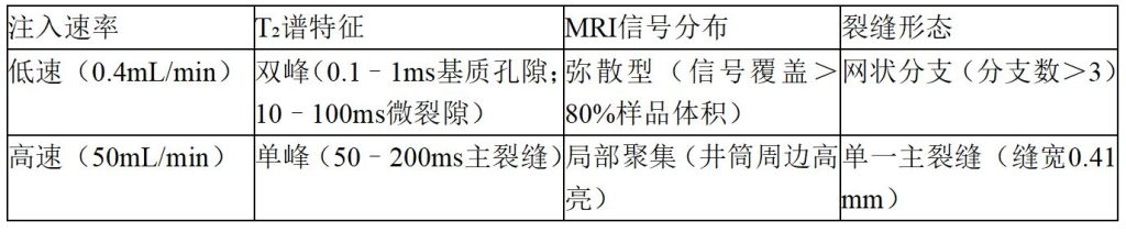 高速區(qū):NMR流體集中于中部(紅色高亮區(qū)),微CT顯示單一主裂縫(縫寬>0.4 mm)。