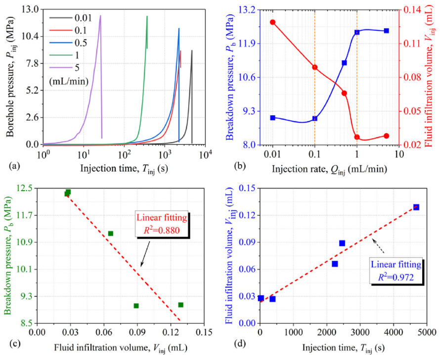 Pb與Vinj呈強負相關(guān)(Pb = -1.05Vinj+ 42.3,R2=0.880),證明實際滲入流體量(非注入速率)主導(dǎo)破裂行為。