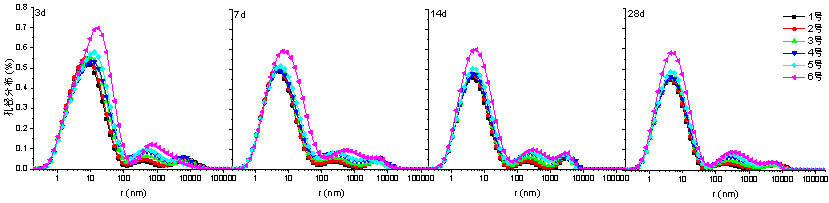 通過對T2分布轉(zhuǎn)化為孔徑分布,具體結(jié)果如圖7所示。水泥基注漿材料的孔徑分布圖顯示三個峰,分別對應(yīng)凝膠孔和毛細孔、毛細孔、大孔。由圖7可見,第一個峰的面積明顯大于第二、三個峰,而第一主峰的孔徑被認為是最可幾孔徑范圍;不同齡期時,水泥基注漿材料內(nèi)大部分孔隙的孔徑均在1~100nm的范圍,而不同減縮劑摻量情況下,水泥基注漿材料的孔徑分布存在明顯差異,這表明微孔特性與減縮劑摻量有關(guān)。此外,從圖中可以看出水泥基注漿材料孔隙主要由微觀孔隙組成,且減縮劑的摻入明顯增加了水泥基注漿材料凝膠孔和毛細孔的含量。