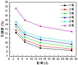 圖8顯示了不同減縮劑摻量隨時間變化對水泥基注漿材料孔隙度的影響。不同減縮劑摻量的水泥基注漿材料孔隙率隨時間呈下降趨勢,但隨著減縮劑含量的增加,孔隙度增加。這說明孔隙度隨著齡期增長而逐漸提高,而到14天齡期后孔隙度增長逐漸減小,且減縮劑摻量越大對水泥基注漿材料孔隙度增長更加明顯。