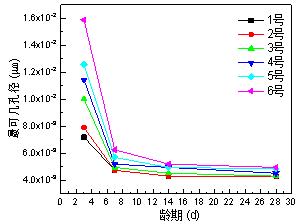圖9顯示了不同齡期最可幾孔徑,從圖中可知,隨著減縮摻量的增加,最可幾孔徑始終增加。與未摻減縮劑空白組相比,摻2.5%和4.5%減縮劑的水泥基注漿材料最可幾孔徑在第3天分別提高了39.09%和120.52%,在第28天分別提高了4.99%和14.97%。此外,隨著齡期增長,減縮劑摻量對最可幾孔徑的影響逐漸減小。