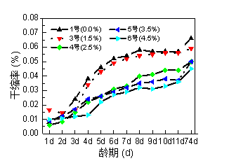 圖3給出了減縮劑摻量對水泥砂漿干燥收縮率的影響。由圖可知,砂漿的干縮率隨減縮劑摻量增加而逐漸減少,但隨齡期增長而趨于穩(wěn)定。