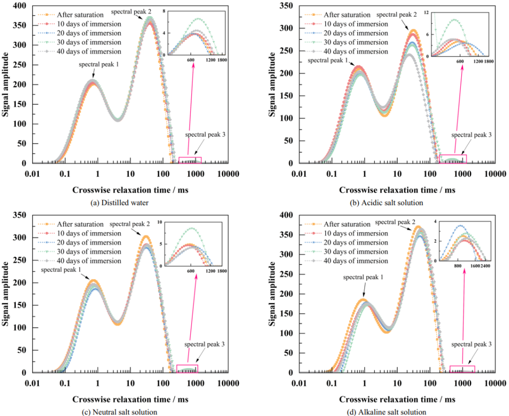 1)譜與孔隙結(jié)構(gòu)的關(guān)系:T2譜的面積和變化率與孔隙半徑密切相關(guān)。根據(jù)核磁共振(NMR)原理,弛豫時(shí)間與孔隙半徑成正比,較長(zhǎng)的T2時(shí)間對(duì)應(yīng)較大的孔隙,較短的T2時(shí)間對(duì)應(yīng)較小的孔隙。酸性鹽溶液可能促進(jìn)孔隙的溶解和擴(kuò)展,而堿性鹽溶液可能促進(jìn)新礦物沉淀和孔隙填充