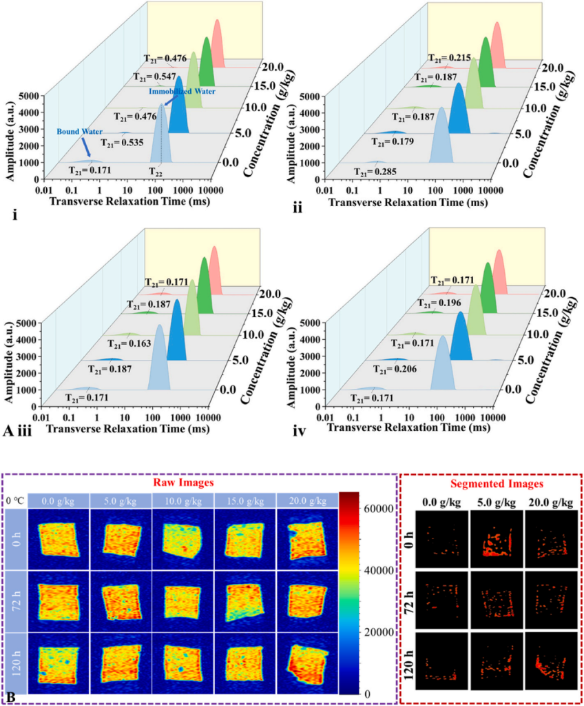 圖1. 不同SCPs添加量的魚(yú)丸在凍藏前后水分狀態(tài)與分布的動(dòng)態(tài)變化: (A) 不同SCPs添加量魚(yú)丸的T2弛豫譜;(B) 魚(yú)丸在0°C凍藏不同時(shí)間后的MRI圖像及其閾值分割圖像(紅色信號(hào)區(qū)域代表高水分含量)。