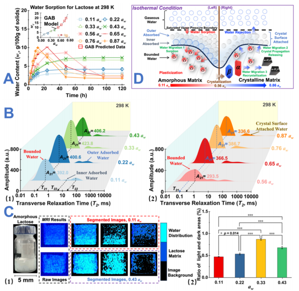 圖1. 無定形乳糖在水分活度aw = 0.11? 0.87及298K條件下的吸水行為與遷移動(dòng)力學(xué)的綜合研究。
