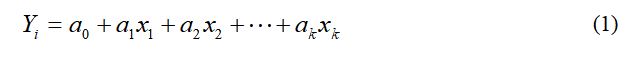 基于正交實驗結(jié)果,在兩個假設(shè)下建立了多元線性回歸模型:(1)其他因素對殘余水飽和度的影響可以忽略不計,(2)實驗室規(guī)模的巖心驅(qū)替實驗代表了實際的二氧化碳地質(zhì)封存項目。使用SPSS軟件對孔隙度、壓力、注入壓差和殘余水飽和度的數(shù)據(jù)進行分析,將后者設(shè)置為因變量,將前三個設(shè)置為自變量。因變量和自變量之間的一般關(guān)系由方程(1)定義。