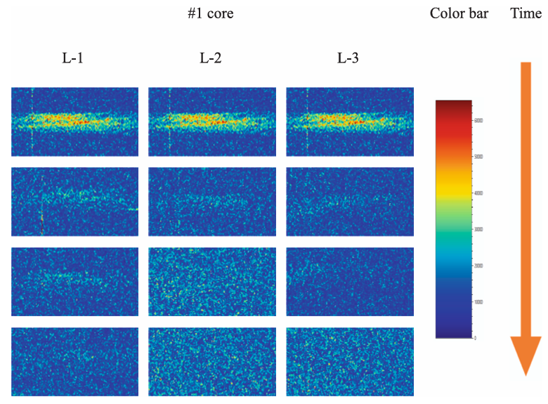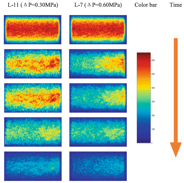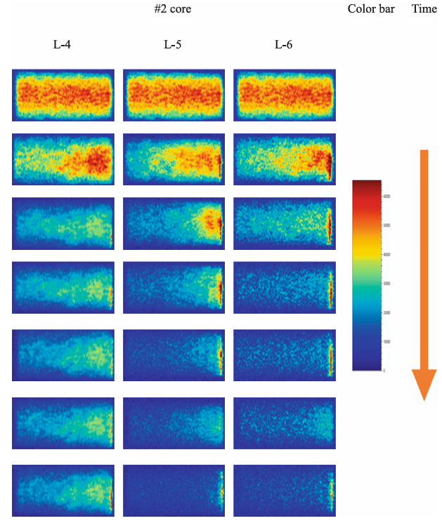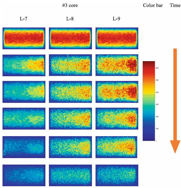 為了分析巖心驅(qū)替過程中的平面內(nèi)水的遷移賦存,MRI可視化了二維水分布(圖15-17)。低(藍色)和高(紅色)信號強度分別對應(yīng)于含水量的降低和升高。MRI圖像顯示了CO2驅(qū)替過程中顯著的空間異質(zhì)性特征(圖15-17)。低孔隙度#1巖心最初表現(xiàn)出微弱的MRI信號,在整個CO2驅(qū)替過程中逐漸衰減,直到與背景噪聲無法區(qū)分,這最終證明MRI圖像質(zhì)量主要受孔隙空間中的含水量控制。與之形成鮮明對比的是,#2和#3巖心最初表現(xiàn)出均勻的水分分布,但在注入二氧化碳的過程中逐漸形成了明顯的非均勻模式:由毛細管捕獲引起的孤立水團和由毛細管末端效應(yīng)引起的巖心出口積水。MRI圖像中觀察到的空間異質(zhì)性對二氧化碳封存的安全性有重大影響。毛細管捕獲的水團簇增強了殘余相捕獲,這可能會產(chǎn)生局部飽和度梯度。因此,確定該水團的分布模式對于定位剩余封存優(yōu)勢區(qū)和預(yù)測二氧化碳羽流滯留路徑至關(guān)重要。出口處的毛細管端部效應(yīng)表明,如果在現(xiàn)場模擬中沒有適當考慮,實驗室測量可能會高估剩余捕獲效率。這些發(fā)現(xiàn)強調(diào)了在儲層模型中考慮孔隙尺度非均質(zhì)性的必要性,以更準確地預(yù)測二氧化碳羽流的長期遷移模式和捕獲機制。