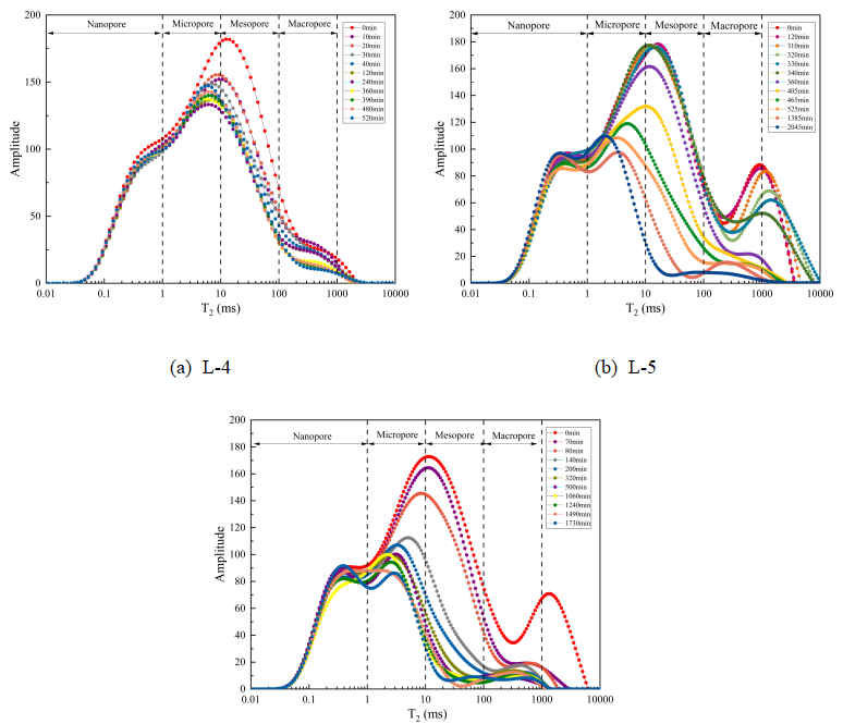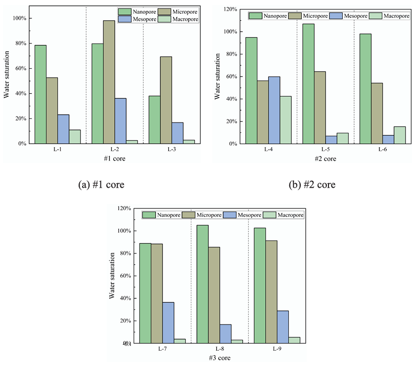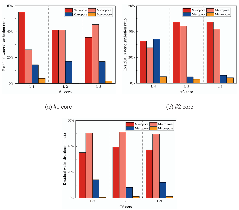 (3)核磁共振分析表明,驅(qū)水效率受孔隙結(jié)構(gòu)的控制。大孔中的水優(yōu)先被驅(qū)替,而納米孔和微孔則是主要的儲存空間,容納了高達90%的殘留水。這一定量結(jié)果突顯了從小孔中回收水的關(guān)鍵挑戰(zhàn)。