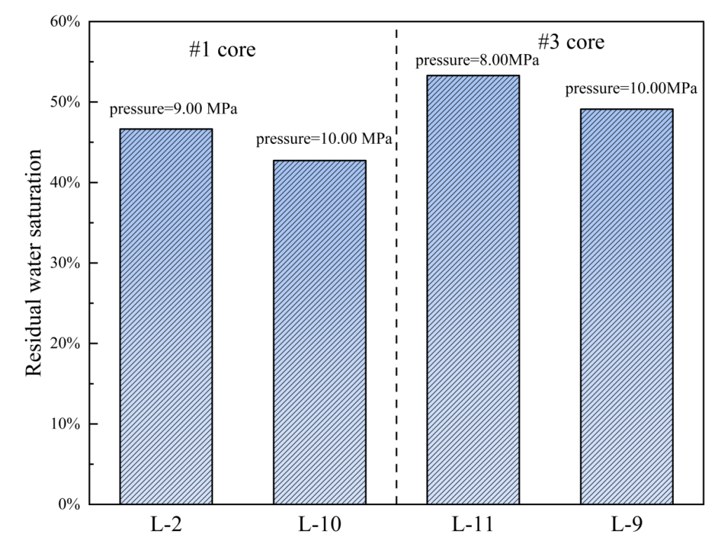 壓力是影響CO2地質(zhì)儲量和地下流體行為的重要因素。在CO2地質(zhì)封存過程中,壓力不僅決定了封存巖層的流體狀態(tài),而且對CO2的注入、運移和封存穩(wěn)定性有直接影響。為了研究壓力對殘余水的影響,在保持其他參數(shù)不變的情況下進行了補充實驗L-10和L-11。實驗結(jié)果如圖6所示。如圖6所示,隨著壓力的增加,殘余水飽和度降低,這驗證了多元線性擬合得到的壓力與殘余水飽和度之間的負相關(guān)關(guān)系。如拉普拉斯方程(方程(3))所示。