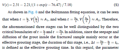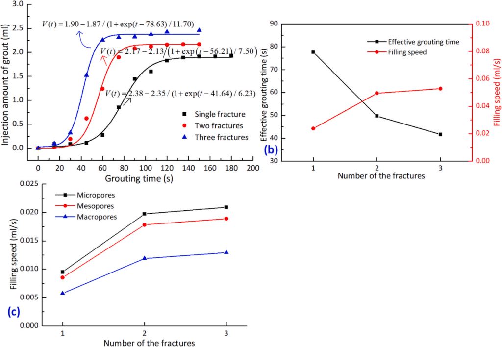 從圖中可以發(fā)現(xiàn),采用玻爾茲曼方程可以很好的擬合漿液注入量與注漿時間的變化關(guān)系。進一步地,通過擬合方程,我們可以定義有效注漿時間(即有效注漿階段的持續(xù)時間)、漿液充填速率(即有效注漿階段曲線的斜率)2個指標對不同條件下注漿滲透擴散特性進行深入分析。