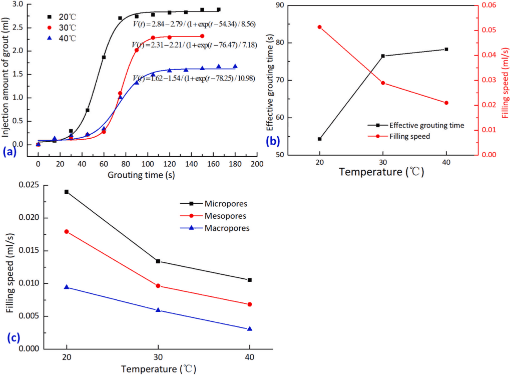 圖6顯示了溫度對滲透注漿擴散特性的影響。溫度對注漿過程的影響主要表現(xiàn)在漿液最終注入量和有效注漿時間等參數(shù)方面。高溫下漿液的黏度增大,流動性下降,導(dǎo)致漿液在孔隙中的擴散阻力增大,從而使得試樣內(nèi)漿液最終注入量減少,有效注漿時間增大,漿液充填速率下降。隨著溫度的升高,3類孔隙中的漿液充填速率均呈現(xiàn)出非線性下降趨勢。并且,相同溫度下,微孔隙的漿液充填速率最大,細孔隙的漿液充填速率次之,而大孔隙的漿液充填速率最小。