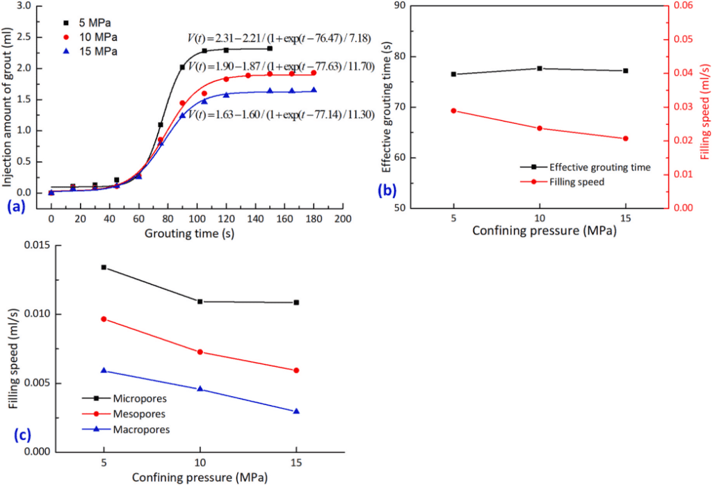 圖7顯示了圍壓對滲透注漿擴散的影響。隨著圍壓的增大,試樣內(nèi)的漿液最終注入量減少。不同圍壓工況下,試樣的有效注漿階段幾乎重合,表明各圍壓下試樣的有效注漿時間相同。然而,低圍壓下試樣的漿液充填速率更大并且,當圍壓小于10MPa 時,漿液充填速率下降幅度更大,漿液的可注性對圍巖變化的敏感程度隨圍壓升高而下降。在較高圍壓下,漿液優(yōu)先向微孔隙中運移擴散,而細孔隙和大孔隙的擴散通道受到抑制,當微孔隙內(nèi)的漿液達到一定充填度后才向細孔隙和大孔隙中擴散。