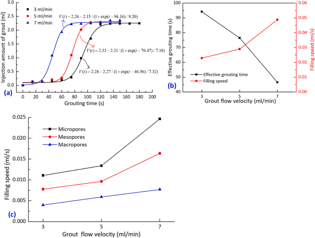 圖8顯示了漿液流速對滲透注漿擴散的影響。不同漿液流速下,試樣內(nèi)漿液最終注入量基本沒有變化,均為2.3 ml左右。然而,不同漿液流速條件引起的有效注漿時間有明顯不同,漿液流速越大,注漿過程完成時間越短。有效注漿時間隨著漿液流速的增大呈直線下降,而漿液充填速率則逐漸增加。隨著漿液流速的增大,漿液更容易進入微孔隙中,漿液在微孔隙中形成了優(yōu)勢通道。這一現(xiàn)象與高圍壓工況類似,漿液流速較高時,漿液優(yōu)先向微孔隙中擴散,之后才對細孔隙和大孔隙的填充,直至注漿結(jié)束。