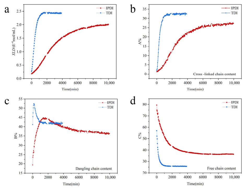 核心規(guī)律:交聯(lián)鏈含量的演化速率與固化劑的 – NCO 基團(tuán)反應(yīng)活性正相關(guān),TDI 的高反應(yīng)性使其快速形成大量交聯(lián)鏈,而 IPDI 的空間位阻延緩了交聯(lián)鏈的生成。