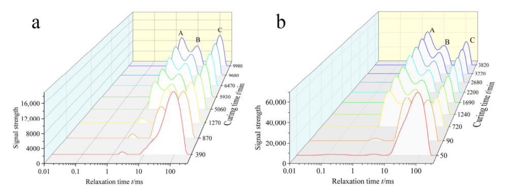 圖2:兩種 HTPB 推進(jìn)劑漿料固化過程中的橫向弛豫時(shí)間(T?)分布,a(HTPB/IPDI 體系)、b(HTPB/TDI 體系)