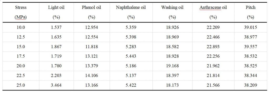 20MPa,輕油產(chǎn)率增大了1.608倍,而酚油、萘油、洗油、蒽油和瀝青則僅為前者的0.824、0.874、0.794、