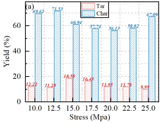 當應力升高至20.0-25.0MPa時,煤樣熱解產(chǎn)物的產(chǎn)率變化相較于10-17.5MPa呈現(xiàn)顯著差異。具體表現(xiàn)為,半焦產(chǎn)率由56.13%增至67.09%,增幅為10.96%;焦油產(chǎn)率由11.93%降至9.99%,減幅為1.94%;煤氣產(chǎn)量由115.96ml/g減少至89.66ml/g,減少量為26.3ml/g。隨著應力值的增加,煤體孔滲明顯下降,且孔隙間連通性較差,導致熱解過程中較大揮發(fā)分的釋放阻力增大,未能及時排出,停留時間延長,從而增加了二次縮合和聚合反應的可能性,進而引起半焦產(chǎn)率的增加,以及焦油產(chǎn)率和煤氣產(chǎn)量的降低。