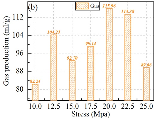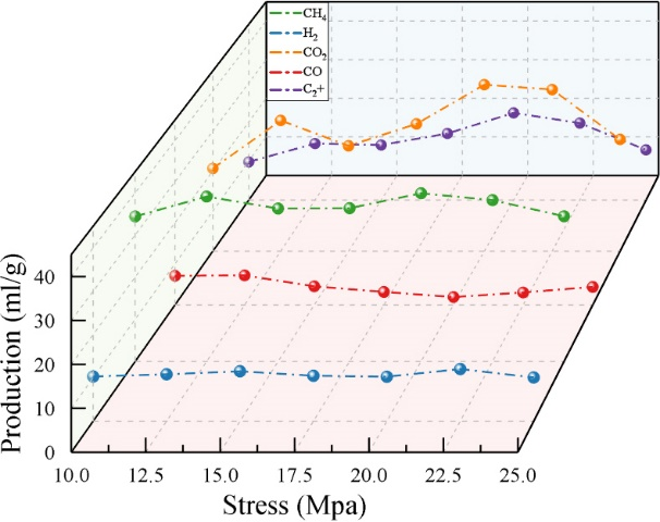 20-25.0MPa,各氣體組分的產(chǎn)量與10-17.5MPa表現(xiàn)出截然相反的趨勢,CO的產(chǎn)量隨應力的增大逐漸增大,其余各類氣體則逐漸減少。其中CO2產(chǎn)量減少13.668ml/g,CH4減少5.449ml/g,C2+烴類氣體減少