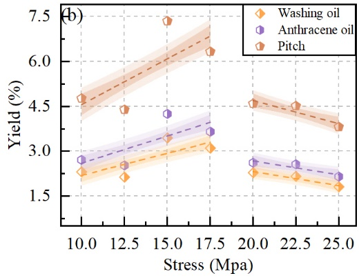 圖9煤焦油各餾分產(chǎn)率與應力的關系(a.輕質(zhì)餾分;b重質(zhì)餾分)