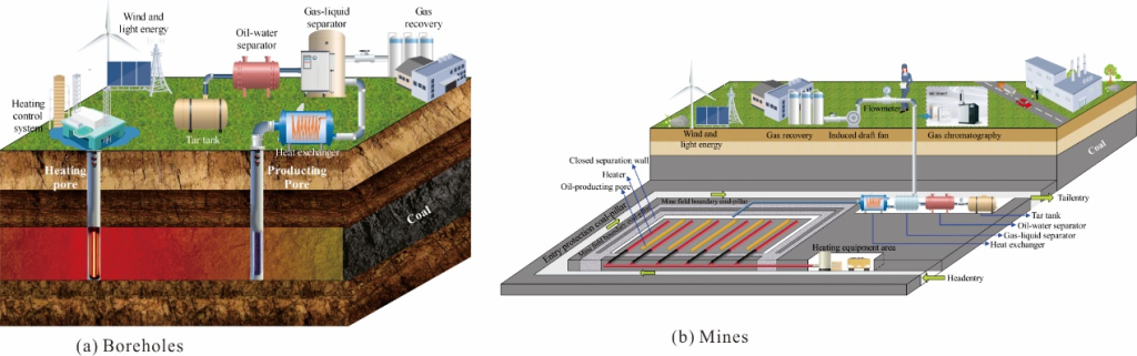 富焦油煤原位熱解(TCIP)是一種綠色低碳技術,從地下富焦油煤層中提取焦油和氣體。覆蓋層壓力是TCIP區(qū)別于傳統(tǒng)地面熱解的關鍵因素。本研究通過模擬研究了軸向壓力對新疆富焦油煤熱解的影響。利用低場核磁共振和氣相色譜法研究了孔隙結(jié)構和揮發(fā)分的變化。結(jié)果表明,在應力約束下,孔隙結(jié)構與油氣組分在熱解過程中展現(xiàn)出協(xié)同演化的趨勢,且這種演化具有明顯的階段性特點。10-17.5MPa,煤體逐漸被壓裂,孔裂隙連通性提高,使得熱解過程中孔裂隙內(nèi)流體對流傳熱加強,導致孔隙不斷擴大,孔滲大幅升高。這種變化促進了熱解產(chǎn)物的釋放,二次反應減弱使得油氣產(chǎn)率持續(xù)增大。焦油中輕油和酚油占比增長幅度較高,煤氣中則是CO2和C2+氣體占比逐漸增大。20-25MPa,煤體逐漸被壓實導致裂隙閉合,開放的孔裂隙對流傳熱方式弱化,擴孔現(xiàn)象減弱。同時,基質(zhì)傳熱的增強導致煤基體內(nèi)部形成了豐富且較小的熱解孔隙,但由于連通性差導致孔滲在不斷降低。這使得油氣釋放阻力變大,二次反應加強導致油氣產(chǎn)率減少,但焦油中輕油和萘油占比以及煤氣中CH4、H2和CO的占比有所上升。