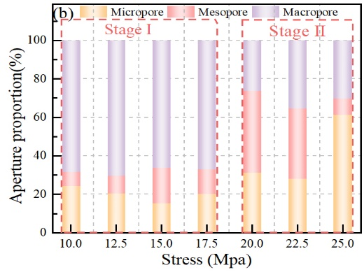 眾多學者對孔徑和弛豫時間的關系進行了深入研究,認為T2<3ms指示的孔隙屬微孔,3ms<T2<170ms屬中孔,T2>170ms屬于大孔或裂縫。本研究基于此,分別計算了各煤樣微孔、中孔和大孔的信號量,并通過與總信號量作比值,確定了不同應力約束下煤樣各孔隙的孔徑占比(圖5b)。10.0-17.5MPa,各煤樣的微孔占比整體偏低,中大孔占據(jù)著主導地位,占比達80%左右。此階段,隨著應力的逐漸增大,煤體逐漸發(fā)生裂解,孔隙間的連通性增強。這促進了熱解過程中孔裂隙內(nèi)流體對流傳熱效應,進而使得連通孔隙在熱解過程中持續(xù)擴展,中大孔占比逐漸增加。這與孔隙表面形貌特征保持一致。在更高的應力范圍下(20.0-25.0MPa),微孔占比從31.30%急劇增大到61.27%,幾乎增大一倍。此應力階段,煤體內(nèi)的裂隙逐漸被壓實,孔裂隙的連通性相應減弱,熱解過程中孔裂隙對流傳熱作用亦趨減弱,連通孔隙的擴孔現(xiàn)象相應降低。與此同時,煤基質(zhì)的熱傳導作用得到加強,導致煤基質(zhì)中形成了眾多相對較小的熱解孔隙,微孔占比顯著增加。