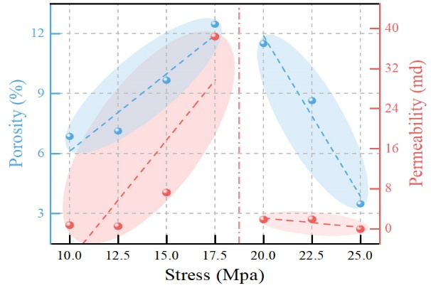 隨著應力的逐漸增加,孔隙度和滲透率的變化趨勢保持一致,均呈現(xiàn)出先上升后下降的特征(圖6)。10.0-17.5MPa,孔隙度從6.88%增大到12.48%,滲透率也相應地從0.77md增大到38.49md。此階段應力作用下煤體被壓裂,使孔裂隙的連通性顯著提升。在熱解過程中,孔裂隙內(nèi)對流傳熱增強,使得孔隙不斷擴大以及合并,從而導致孔滲急劇增大。20.0-25.0MPa,孔隙度和滲透率顯著降低,分別從11.53%和1.87md減小到3.51%和0.01md。此階段,更高的應力約束使得煤體遭受更強烈的壓實作用,導致裂隙閉合,孔裂隙的連通性明顯減弱。盡管這增強了熱解過程中煤基質(zhì)的傳熱效應,并在煤基質(zhì)中形成了豐富的孔隙,但由于尺寸相對較小且連通性較差,最終導致孔隙度和滲透率呈下降趨勢。
