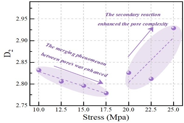 (1) 應力約束下孔隙結(jié)構的演化呈現(xiàn)明顯的階段性。10-17.5MPa,煤體逐漸被壓裂,孔裂隙相互連通,熱解時孔裂隙內(nèi)流體對流傳熱增強,孔隙不斷擴大,孔滲隨之增大,分形維數(shù)減少。20-25MPa,煤體被壓實,裂隙閉合導致孔裂隙連通性變差,孔隙內(nèi)對流傳熱弱化,基質(zhì)傳熱增強導致基質(zhì)上形成了新的獨立小孔隙,使得孔滲降低,分形維數(shù)增大。