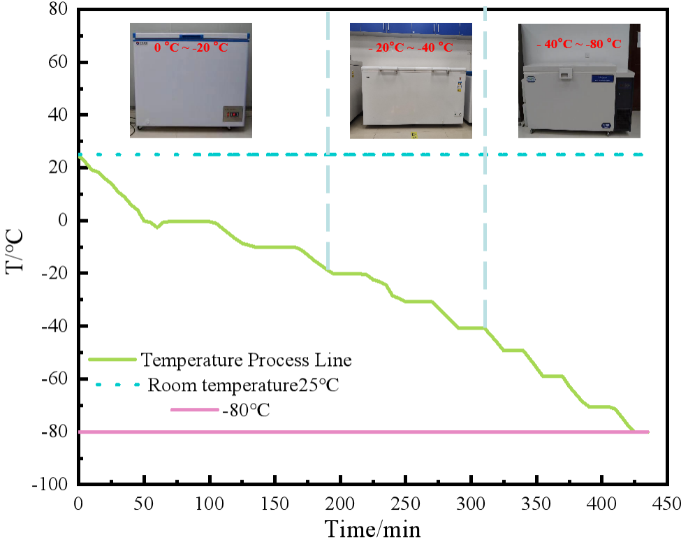 -20°C降至-40°C;最后,使用超低溫冰箱將樣品溫度從-40°C降至-80°C。使用XSL-D180LM2V0巡檢儀采集器監(jiān)測樣品溫度變化,當樣品整體溫度達到目標溫度時開始測試。冷卻過程如圖2所示。