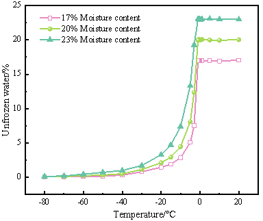 時仍存在少量未凍水,含量約為0.1%。在極低溫條件下,不同初始含水量的未凍水含量幾乎相同。