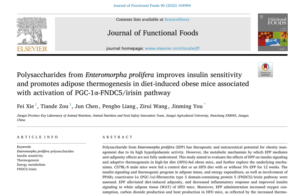 對(duì)此,江西農(nóng)業(yè)大學(xué)動(dòng)物與營(yíng)養(yǎng)實(shí)驗(yàn)室謝飛,鄒天德一行2022年發(fā)表于《Journal of Functional Foods》的《Polysaccharides from Enteromorpha prolifera improves insulin sensitivity and promotes adipose thermogenesis in diet-induced obese mice associated with activation of PGC-1a-FNDC5/irisin pathway》的文獻(xiàn)揭示了,滸苔多糖可以防止哺乳動(dòng)物高脂肪飲食引起的肥胖。證實(shí)了,滸苔多糖通過(guò)提高飲食誘導(dǎo)的肥胖小鼠的胰島素敏感性并促進(jìn)脂肪產(chǎn)熱,從而發(fā)生能量消耗達(dá)到反肥胖反應(yīng)的效果。