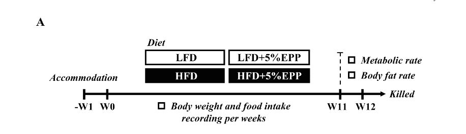 該文獻(xiàn)研究者將實(shí)驗(yàn)小鼠隨機(jī)分為4組,每組10只,分別為L(zhǎng)FD(低肪飲食),HFD(高脂飲食);LFD+5%EPP(低肪飲食+5%滸苔多糖),HFD+5%EPP(高肪飲食+5%滸苔多糖)。實(shí)驗(yàn)設(shè)計(jì)如圖2,