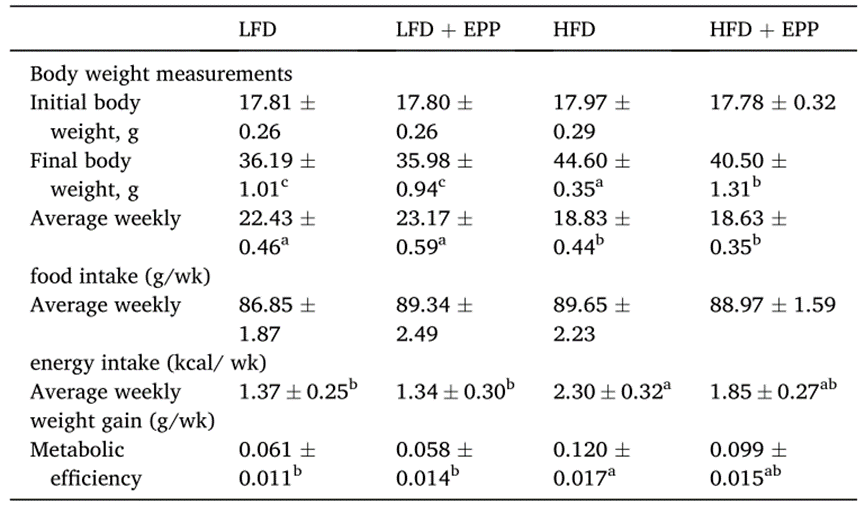 除上小鼠體成分指標(biāo)測(cè)試外,本研究還使用多種分析測(cè)量?jī)x器及分析方法測(cè)量分析了血清鳶尾素濃度,組織學(xué),免疫組化等多種代謝指標(biāo)(這里不再一一展開(kāi))。研究結(jié)果除EPP飲食可明顯預(yù)防飲食引起的肥胖外,還表明: