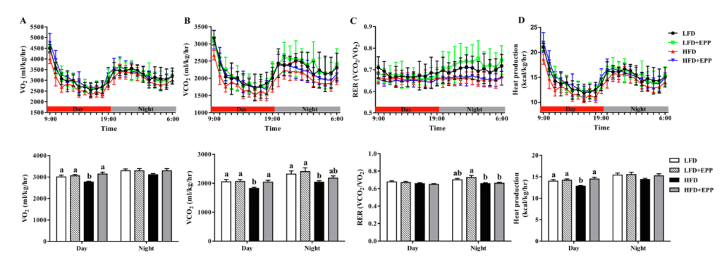 產(chǎn)量(VCO2)及其平均值。(C)根據(jù)代謝室數(shù)據(jù)計(jì)算呼吸交換比(RER、VCO2/VO2).(D)12h光-12h暗循環(huán)期間的產(chǎn)熱量及平均值。結(jié)果表明:與高脂飲食組相比,EPP組小鼠在白天的耗氧量、二氧化碳產(chǎn)量和產(chǎn)熱量均較高,夜間(活動(dòng)期),高脂飲食小鼠的RER低于LFD+EPP小鼠。總之膳食EPP通過(guò)增加了高脂肪喂養(yǎng)的肥胖小鼠的能量消耗,從而達(dá)到預(yù)防飲食引起的肥胖。