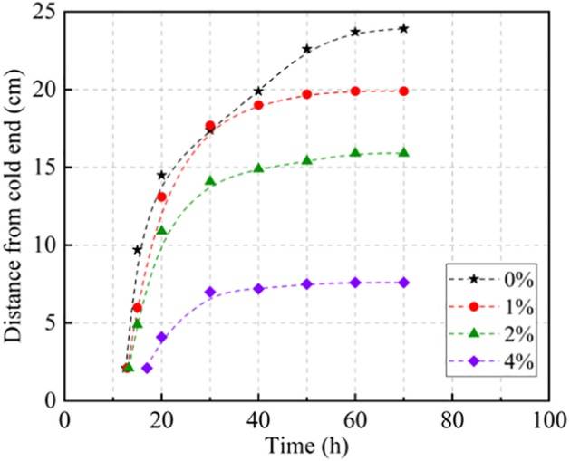 以前的研究表明,單向凍結(jié)期間的溫度分布在靠近冷端的部分是線性的,在非穩(wěn)態(tài)的暖端附近是曲線線性的。因此,非穩(wěn)態(tài)的凍結(jié)前沿的位置也是通過線性插值確定的,因?yàn)樗趦鼋Y(jié)的早期階段接近冷端。圖4說明了凍結(jié)前沿位置的演變,即與冷端的距離隨著時(shí)間發(fā)生推移??梢钥吹剑瑑鼋Y(jié)前沿在凍結(jié)開始時(shí)移動(dòng)得很快,然后在凍結(jié)過程結(jié)束時(shí)逐漸達(dá)到一個(gè)熱平衡狀態(tài)。在快速移動(dòng)階段,由于鹽引起的冰點(diǎn)變低,鹽含量較高的樣品,其凍結(jié)前沿移動(dòng)速度比鹽含量較低的樣品慢。在穩(wěn)定階段,凍結(jié)前沿的最終位置取決于鹽含量,鹽含量較低的土壤樣品在更加遠(yuǎn)離冷端的地方有一個(gè)凍結(jié)前沿。此外,鹽隨水向冷端遷移,在孔隙水凍結(jié)時(shí)被排斥在冰外。因此,鹽的濃度在凍結(jié)前沿附近增加,這進(jìn)一步抑制了向上運(yùn)動(dòng)。
