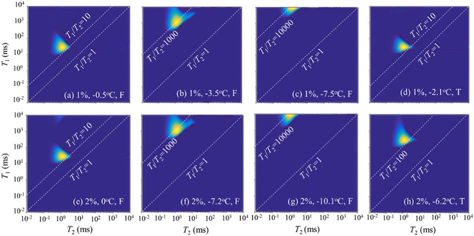 如圖5所示,選擇了四個(gè)溫度下兩種鹽含量的樣品得到的低場(chǎng)核磁T1-T2測(cè)試結(jié)果,以說明F-T期間T1-T2相關(guān)光譜的代表性階段以及溫度和鹽含量的影響。具體來說,挑選了四個(gè)溫度,如圖5所示。從每個(gè)樣品中選擇了一個(gè)低于冰點(diǎn)的溫度(例如,1%鹽含量的-3.5℃和2%鹽含量的-7.2℃),以便來分析溫度和鹽含量對(duì)水分子流動(dòng)性的影響。T 1/T 2比率是一個(gè)說明分子流動(dòng)性的特征參數(shù)。