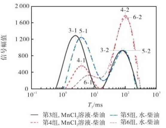 與圖2類似,第 3~6 組試樣的T2譜曲線均呈雙峰狀。由于 5g/L的 Mn2+作用,第 3、 4 組已經(jīng)將油和水的信號分離,其 T2 譜曲線雙峰分離。進一步分析每個峰的情況,現(xiàn)在對4組曲線進行定量分析。