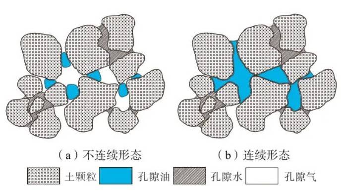 究其原因,在多孔介質(zhì)中, 非水相液體(NAPLs)可能賦存形態(tài)為不連續(xù)形態(tài)和連續(xù)形態(tài)(圖 5)。其中當 NAPLs 的含量超過殘余飽和度時,NAPLs 更多地以連續(xù)形態(tài)存在,但不會占據(jù)所有大孔隙空間。粉土中的柴油作為非浸潤液體,可能因為含油率的增加,小孔隙油(如圖 5(a)所示)合并為大孔隙油(如圖 5(b)所示),分布在大孔隙中。 03