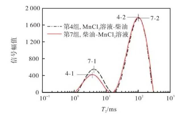 第 4 組和第 7 組試樣的總峰面積幾乎相等,這說明配制的樣品是可靠的。進一步分析發(fā)現(xiàn),發(fā)現(xiàn)第 7 組的第 1 峰面積略小于第 4 組的第 1 峰 面積?! ∠鄳?,第 7 組的第 2 峰面積略大于第 4 組的 第 2 峰面積.由于第 2 峰主要由柴油的核磁信號構 成,第 1 峰主要由 MnCl2溶液的核磁信號構成,因此,相較于制樣時第 1 相為水的情況,第 1 相為柴油時,柴油優(yōu)先進入較大孔徑的孔隙,后加入的水更多地進入大孔徑的孔隙。