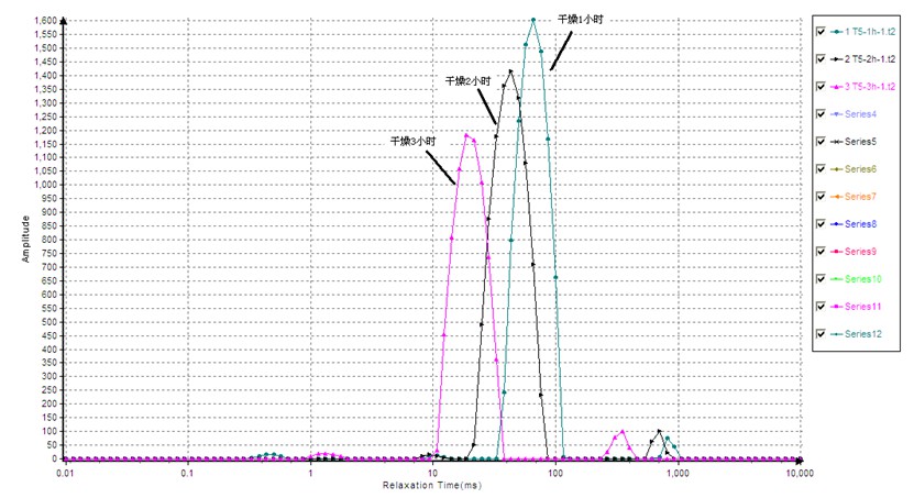 從上圖可知,在干燥3小時(shí)樣品中存在的析出水峰和肌肉結(jié)合水峰在干燥4.5小時(shí)的樣品中消失了,因?yàn)樵俣痰奈龀鏊錞2值總是要比初始肌肉結(jié)合水T2長(zhǎng)的,顯然在大于65ms以外的地方在干燥4.5小時(shí)的譜上沒(méi)有任何的峰存在。當(dāng)樣品不再析出水分了,說(shuō)明肌肉組織已經(jīng)遭到破壞沒(méi)有持水力了,肌肉結(jié)合水也完全消失。因此,從第二個(gè)階段起,圖上的譜峰已經(jīng)不再是析出水分和肌肉結(jié)合水了。